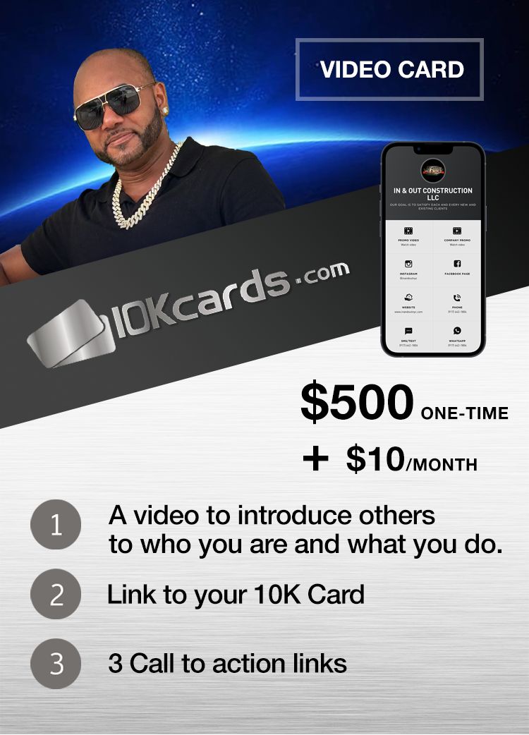 Leave a lasting impression on your clients with the new Video way to present yourself. Pay a one time cost of ONLY $500 to set up and ONLY $10/month subscription to maintain your Video Business Card.